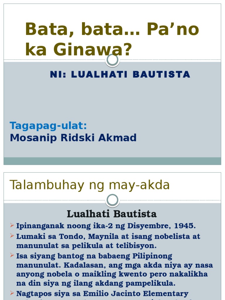 BATA BATA PAANO KA GINAWA Sa paksang ito ating tatalakayin kung ano nga ba ang buod ng kwentong Bata Bata Paano Ka Ginawa. Sa mga nakalipas na panahon sunud-sunuran. Ay isang nobelang Tagalog na nabuo mula sa malikahaing isipin ni Lualhati Bautista.