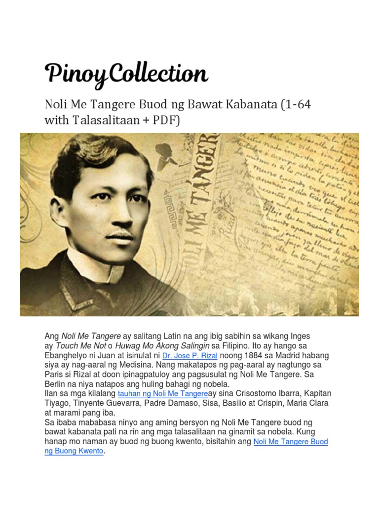 Ang Noli Me Tangere ay salitang Latin na ang ibig sabihin sa wikang Inges ay Touch Me Not o Huwag Mo Akong Salingin sa Filipino. Tila wala man lang ipinag-unlad ang bayang iyon. Noli Me Tangere Kabanata 4 Erehe at Pilibustero.