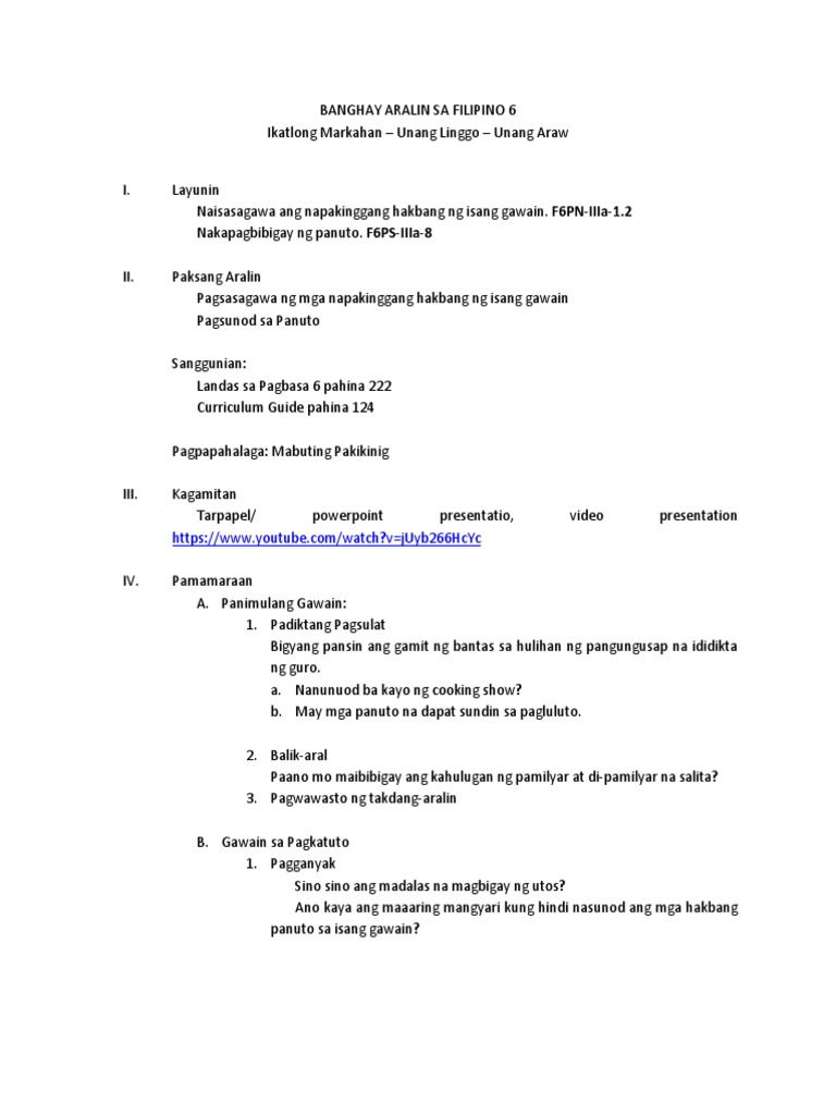 Some of the worksheets for this concept are Filipino baitang 2 ikaapat na markahan Filipino baitang 1 ikatlong markahan Basic education filipino department holy angel university To 12. _____ Banghay Aralin sa FILIPINO 3 Aralin 8. Pagbibigay Ng Wakas Sa Binasa Grade 6.