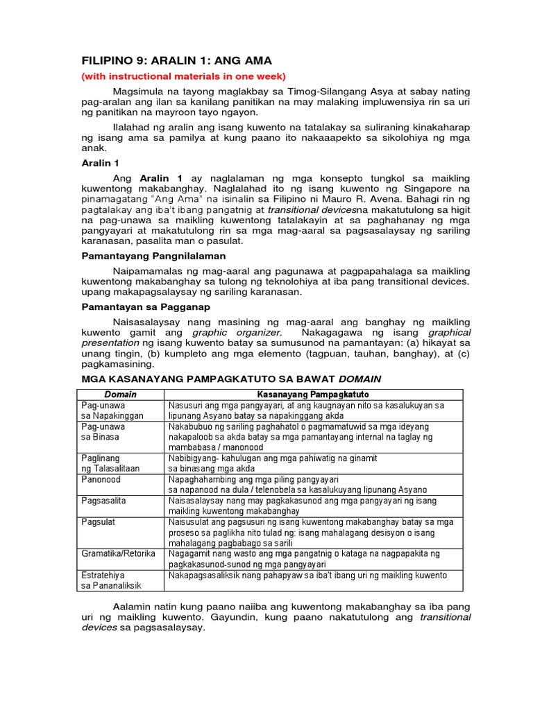 ANG AMA Maikling Kwentong Makabanghay- Singapore Isinalin sa Filipino ni Mauro R. Ito ang pinakamataas na pangyayari climax Kakalasan. Pagkakasunod-sunod ng mga pangyayari.