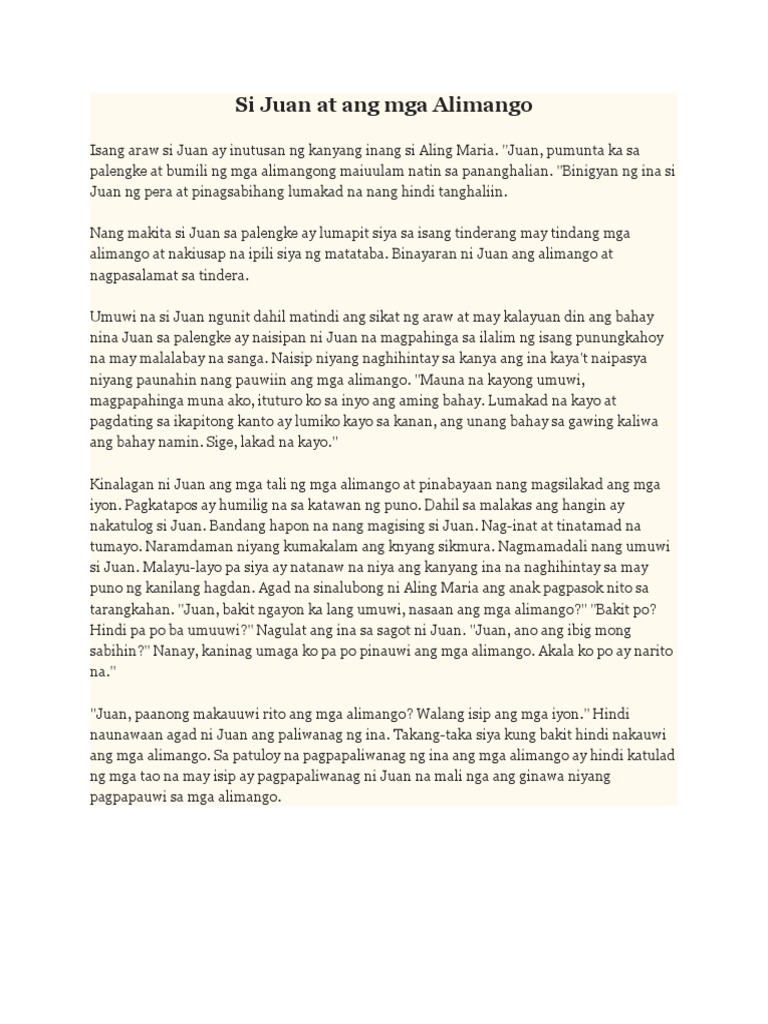 Gayunpaman siya ang nag-iisang kasama ng kanyang ina kung kayat siya lamang ang nauutusan nito. Simula Kabilang sa simula ang mga tauhan tagpuan at suliranin. Si Juan at ang mga Alimango Ang Babaeng Ubod ng Talino Bakit may Pulang Palong ang mga Tandang.