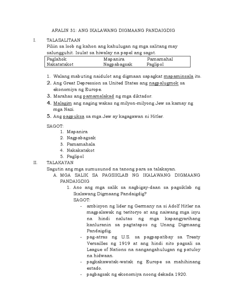 At 3Nakapagbabahagi ng saloobin tungkol sa pangunahing dahilan ng pagsiklab ng Unang digmaang Pandaigd Pagsagot sa Gawain 1. Walang ibang sigalot bago ito nagtakda ng napakaraming sundalo o nagkaroon ng mga naging bahagi na mga tao. Natapos ito hanggang 1945 at nasangkot ang karamihan ng mga bansa sa daigdig at bawat kontinente na may naninirahan.