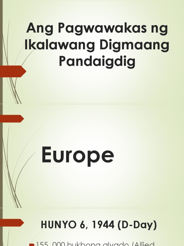 Ito ay bilang pagpapahayag na tuluyan ng magwawakas ang Ikalawang Digmaan sa buong panig ng mundo. Mga salik at kaganapan na nagbigay-daan sa pag-usbong ng Ikalawang Digmaang Pandaigdig Sa pagitan ng taong 1935 at 1939 binalot ng pandaigdigang krisis at marahas na pagbabagong pampulitika ang buong EuropaIto ay nakaapekto sa iba pang mga kontinenteng karatig nito. Ang karanasan ng mga Asyano sa mga nakalipas na digmaan ay nagpaigting ng diwa ng nasyonalismo na nagging daan sa pagkamit ng kalayaan ng mga bansa sa Silangan at Timog Silangang Asya.